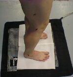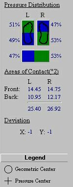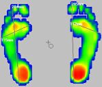 Click on the Analyse Icon to see the foot's image. It will take a few seconds before the position stabilises. Click a second time on the same icon to finish the registration. The software automatically calculates the position of the centre of pressure, the position of the geometric centre, the distribution of weight and the front, back and global surface. The displacement of the centre of pressure shows an unbalanced posture. A more in deep exam by a specialist will be necessary to determine the precise cause of the unbalance.